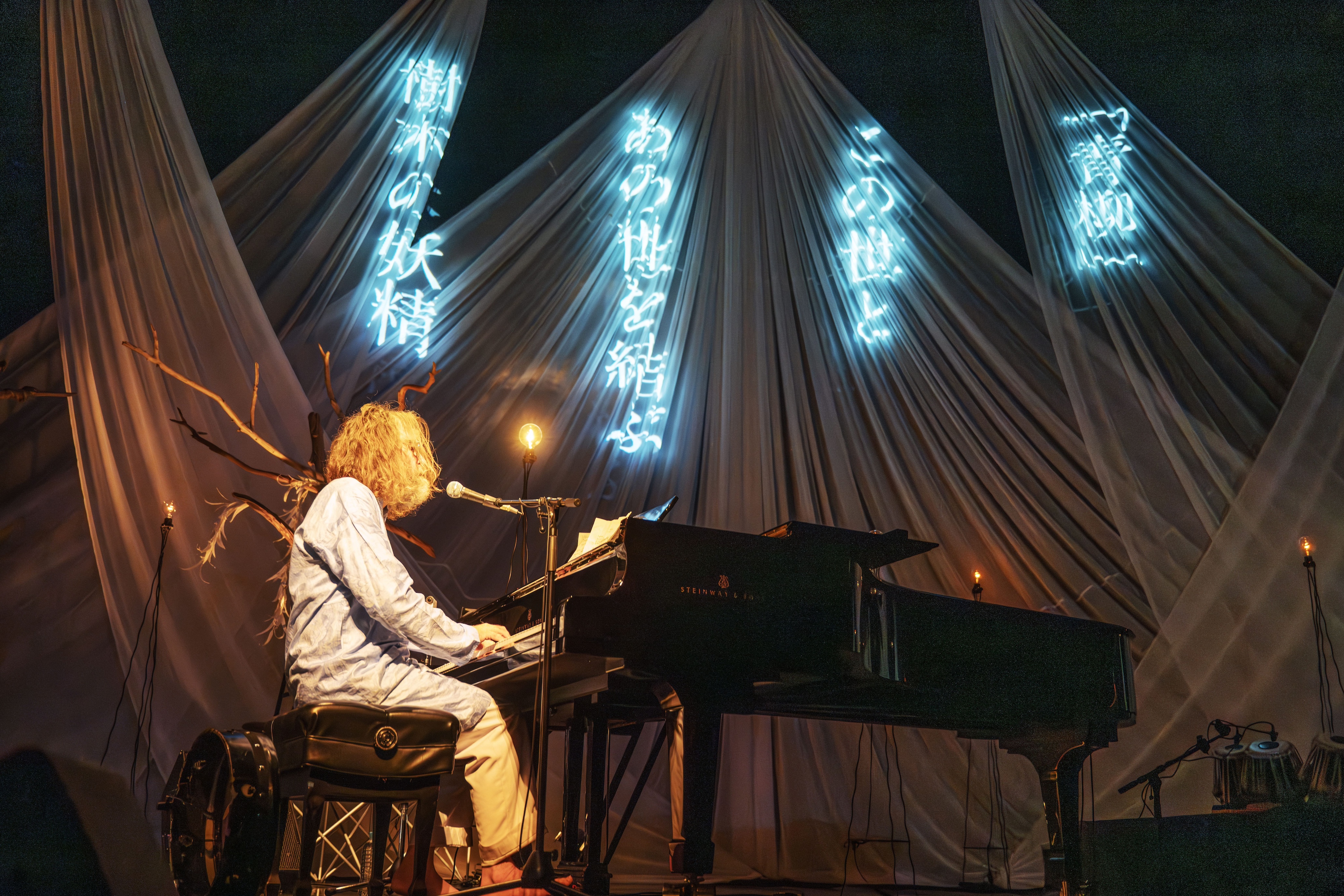 舞台美術では、白い紗幕を立体的に配置し、映像や絵を投影するとともに、樹木造形作家によるオブジェを設置しました。観客の想像力を喚起する幻想的で美しい空間を創出し、小泉八雲怪談の神秘性と詩情を効果的に表現することができました。