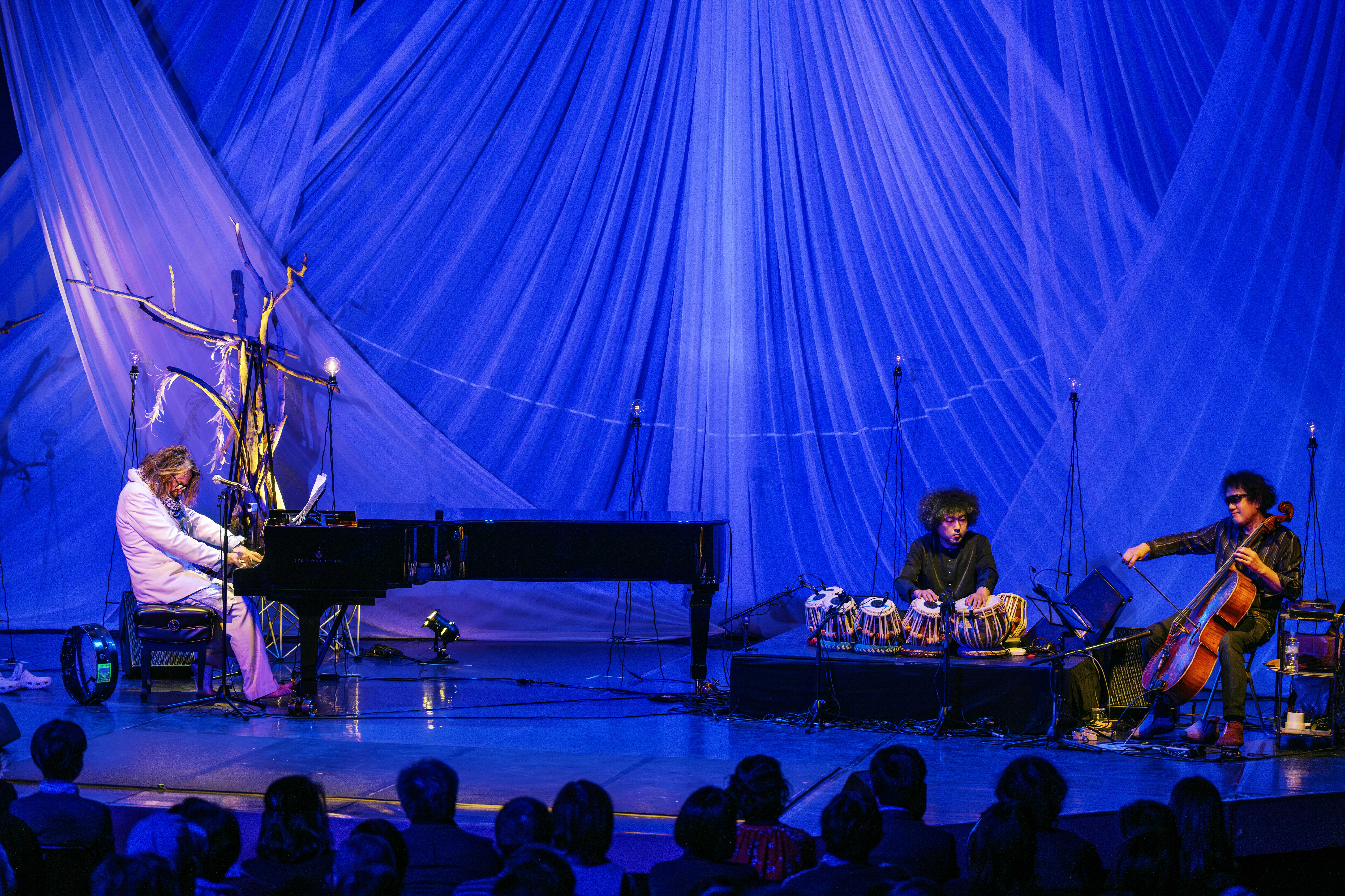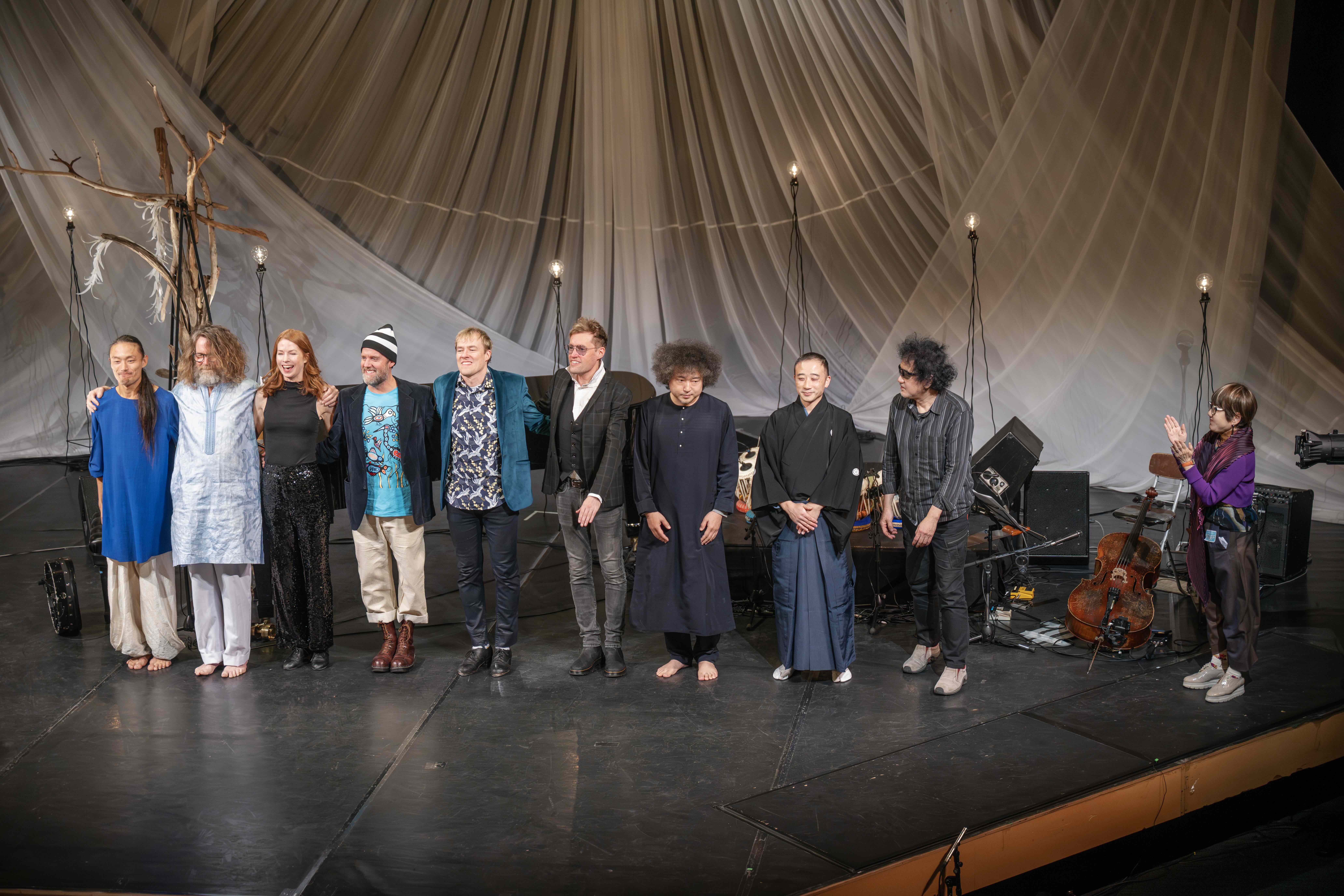 世界的に活躍する音楽家・ダンサーが一堂に会し、ジャンルや国境を越えた特別なパフォーマンスを披露する一夜となりました。「青柳」は柳の精霊を題材とし、樹木が伐られることで命を断つという物語です。O B Aは死へのレクイエムとしての舞を表現し、リアム・オ・メンリィの魂を揺さぶる歌声をはじめ、タブラ、チェロ、大鼓が物語世界を豊かに彩りました。伝統音楽と現代表現、ケルトの躍動的なダンスが融合した、極めて完成度の高い舞台となりました。