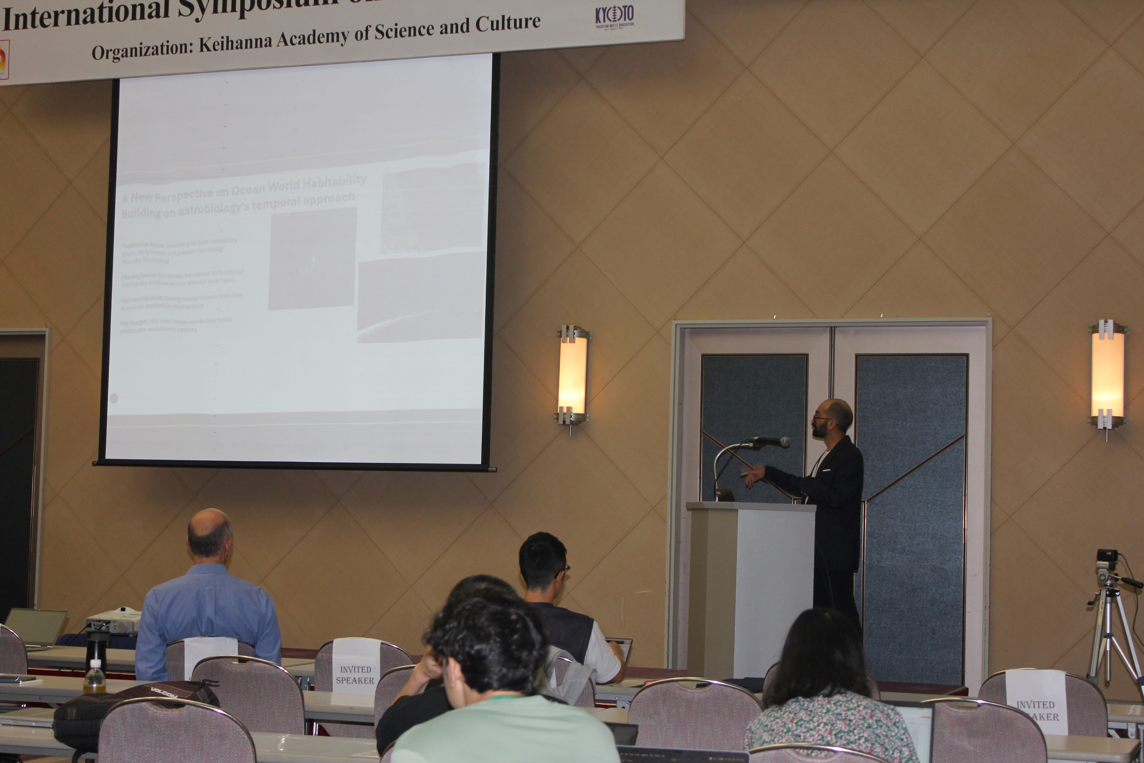 写真紹介:写真右端はシンポジウムで講演する池原健二 - 教育、学術に関する国際的な活動 大阪・関西万博2025と並行して行われているけいはんな万博2025の事業の一つとして開催されるこの国際シンポジウムは、RNA ワールドやアストロバイオロジー、タンパク質ワールドなど異なる立場から生命の起源を研究されている人たちが一堂に介し、議論することによって生命の起源の謎に迫ることを目的としている。この国際シンポジウムをきっかけとして生命起源の”謎”に加えて生命とは何か?を考える研究の進展を目指す。